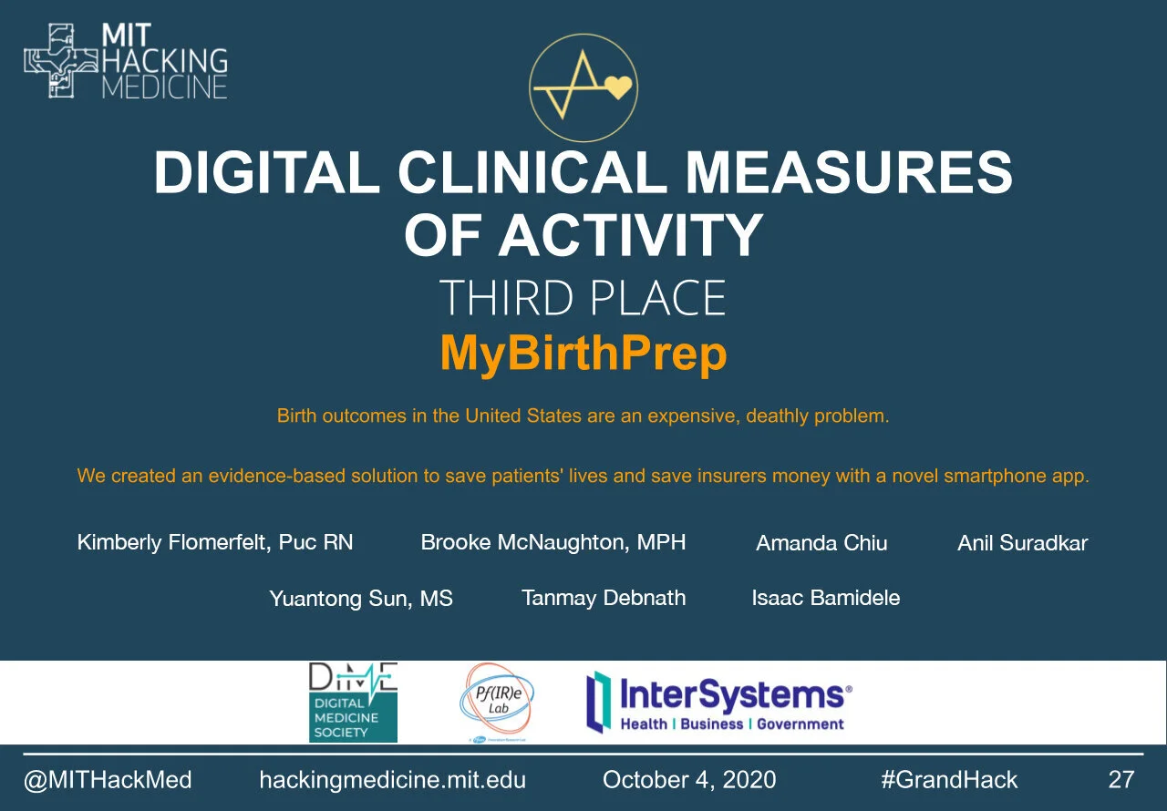 In my first-ever hackathon, I collaborated online, with an international team of 7, over a 2-day sprint, where we developed an evidence-based solution to improve birth outcomes, lower healthcare insurance provider costs, and improve patient outcomes.